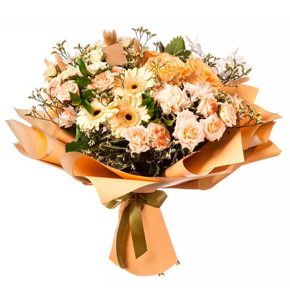 На фото представлен образец. Объем букета зависит от выбранного вами размера. Точное количество цветов и цветовую гамму вы можете уточнить у менеджера по телефону.